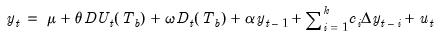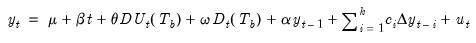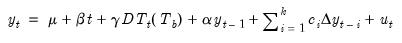The unrestricted Dickey-Fuller equation tests the random walk with drift against a trend stationary with intercept and trend break alternative.