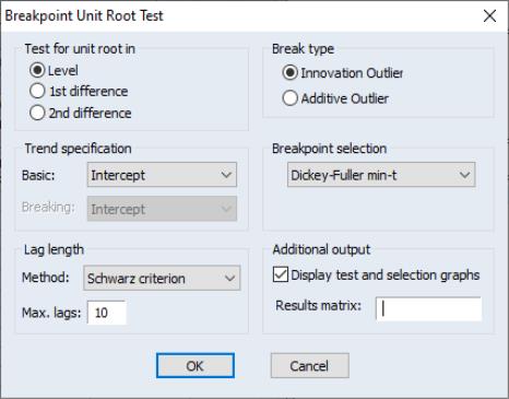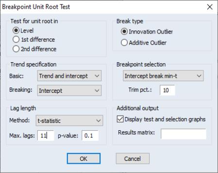 To perform the unit root test with breakpoints, we click on which brings up the test dialog. In this example Perron tests for the existence of a unit root of the data in levels. The test assumes an innovation outlier break, with a trend specification given by Model 2 (