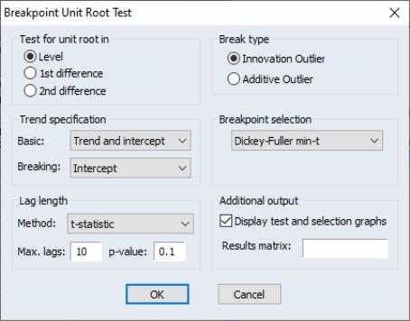 We can match these settings by clicking the Level and Innovation Outlier buttons, changing the Basic Trend specification to Trend and Intercept and the Breaking Trend specification to Intercept, selecting Dickey-Fuller min-t as the Breakpoint selection, and changing the Lag length Method to F-statistic: