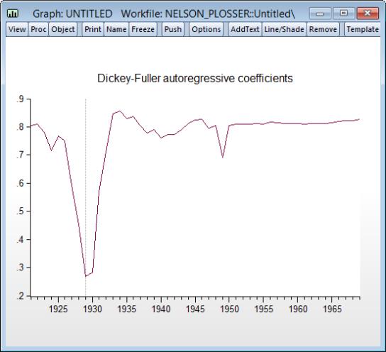 Again, the top section of this output describes the test that was performed, notably the underlying series, the trend and break specifications, and the break type. From the second section we can see that again a date of 1929 was chosen as the most likely break date. The t-statistic based lag selection selected seven lags for this test regression.
