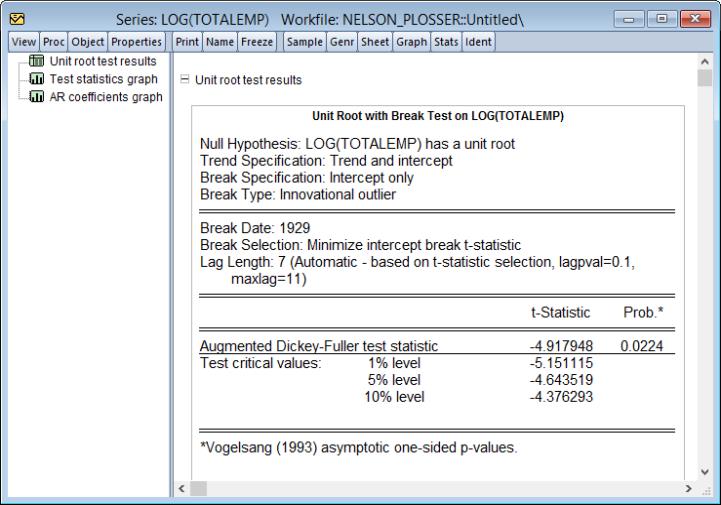 Here, 1920 was selected at the most likely break date, and the automatic lag selection routine selected 9 lags.
