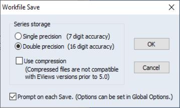 You may also choose to save your data in compressed or non-compressed form. If you select , EViews will analyze the contents of your series, choose an optimal (lossless) storage precision for each series, and will apply compression algorithms, all to reduce the size of the workfile on disk. The storage savings may be considerable, especially for large datasets containing lots of integer and 0, 1 variables. We caution however, that a compressed workfile is not backward compatible, and will not be readable by versions prior to EViews 5.