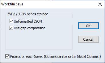 If you are saving your workfile in the newer WF2 format, you will be presented with JSON save options. You may choose to whether or not to write in Unformatted JSON format and whether to use GZIP compression. Checking the former will save the workfile in a verbose, human-readable JSON format. Checking the latter will minimize the resulting file size by saving the workfile using compression.