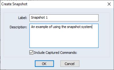 In the Create Snapshot dialog, you can specify your own label and description for the snapshot. For workfiles, EViews will also let you include any captured commands that were generated since the last snapshot. All of this information will be saved along with the snapshot.