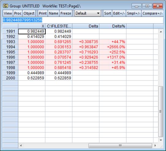 Now with both workfiles open, you can easily inspect differences and copy over individual observations by hand.